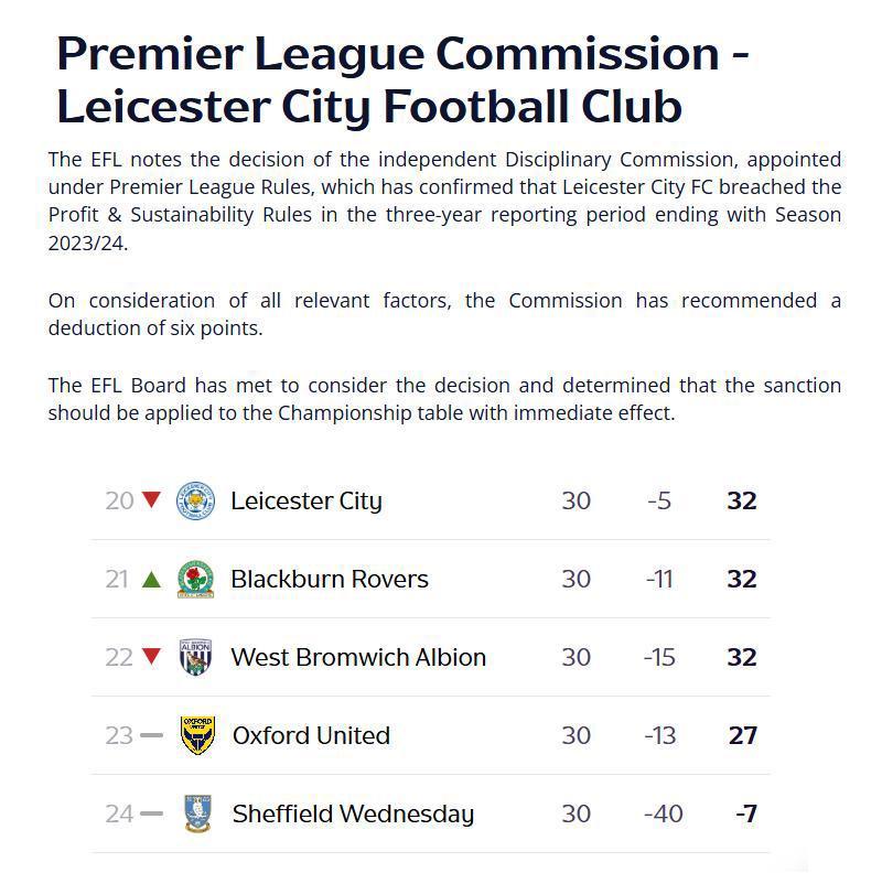 这支十年前还站在英超之巅的球队,如今或因被扣这6分,一夜之间被推向降级边缘。在被罚分之前,莱斯特城30轮积38分,排名英冠第17,看似仍有回旋空间。但随着6分被直接扣除,积分瞬间跌至32分,排名滑落到第20位。他们仅仅凭借净胜球优势,才勉强留在降级区之外。现如今俱乐部主帅下课,阵容动荡,又遭遇2连败,士气低迷,真的是雪上加霜啊!