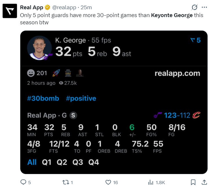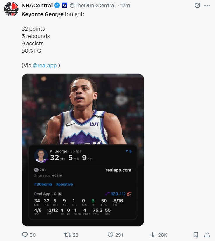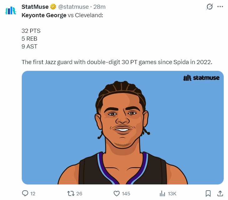 乔治此役是2022年后首位爵士后卫在克利夫兰主场拿下30+。